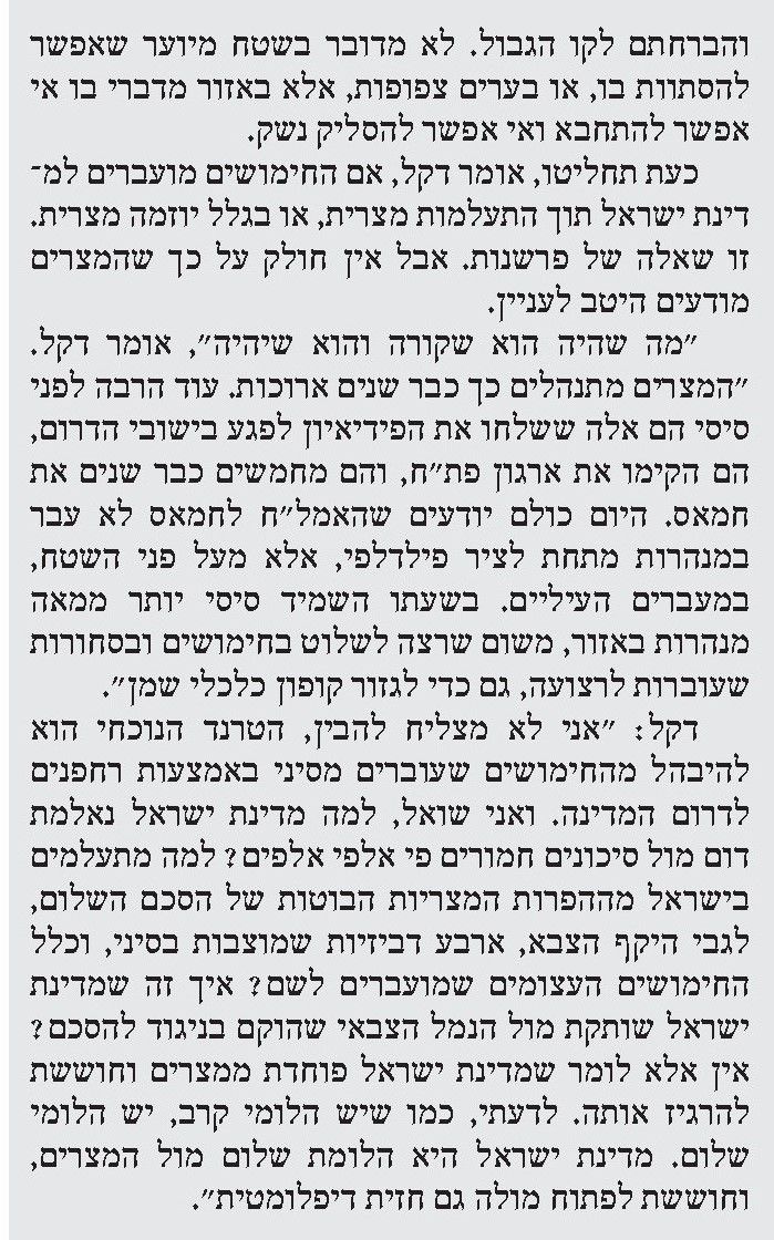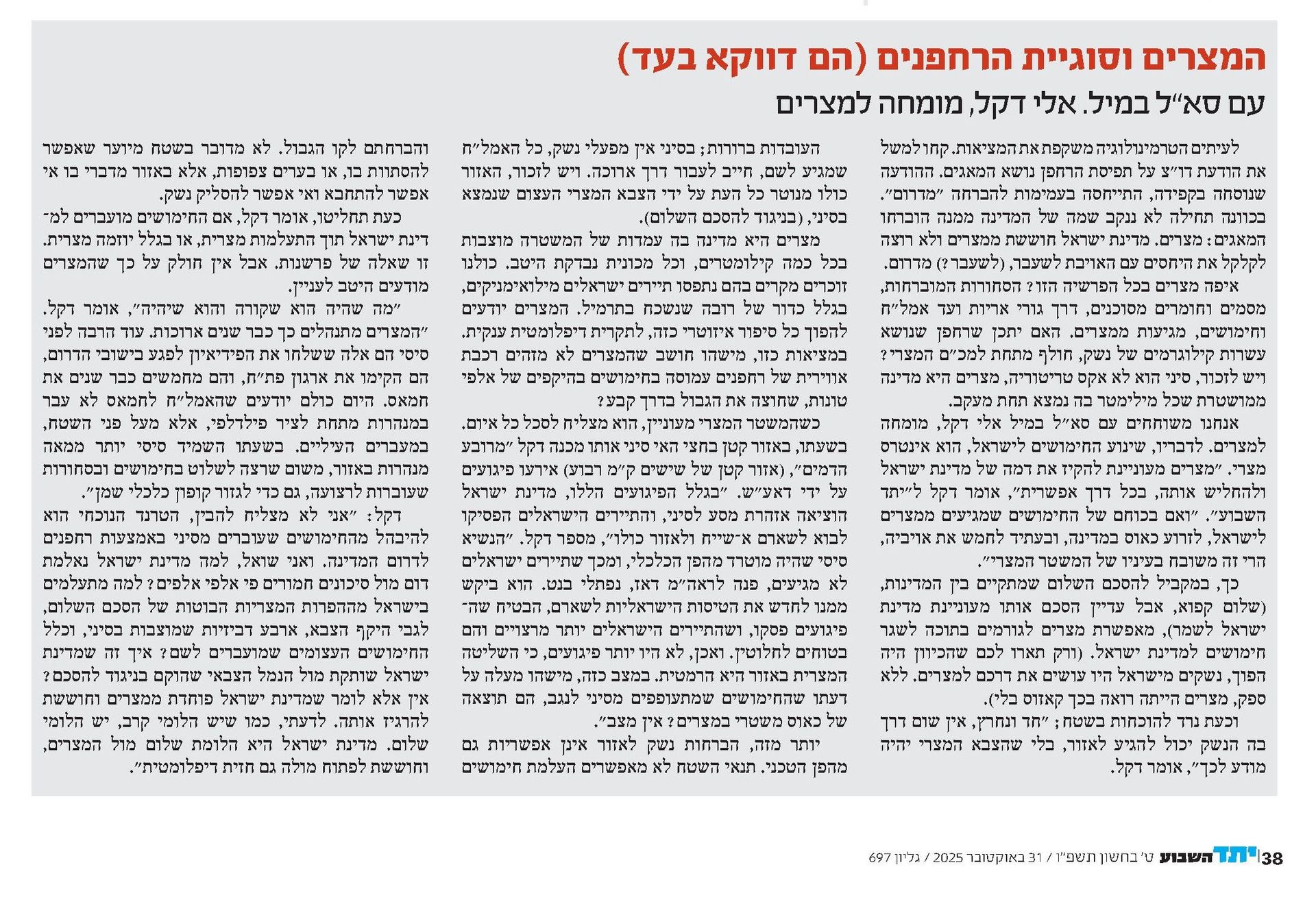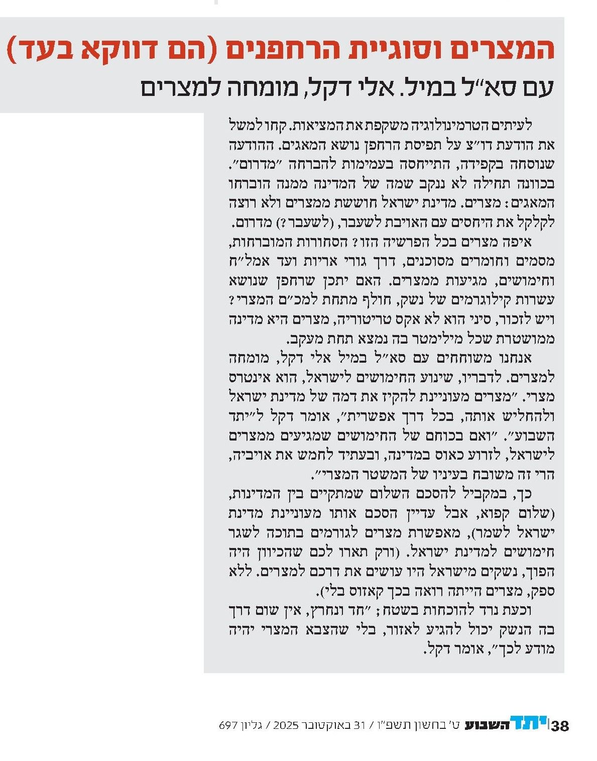 ט.כץ מהעיתון "יתד נאמן" פרסמה כתבת תחקיר גדולה על בעיית הרחפנים עמוסי הנשק המגיעים לישראל מסיני. בין המרואיינים לתחקיר היה גם אלי דקל. לדעתו המצרים היו יכולים למנוע תופעה זו לו היו חפצים בכך. בכתבה מפרט דקל את עמדתו זו. המאמר פורסם בתאריך ט' בחשוון ה'תשפ"ו.